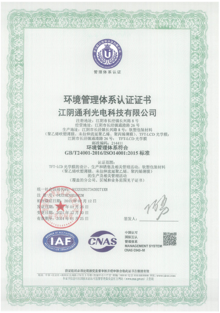 2015年2月12日初次通過ISO14001體系認(rèn)證。