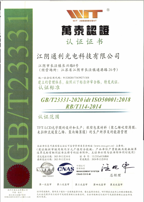 2021年12月10日 通過了ISO50001體系認(rèn)證,通過節(jié)能降耗對能源績效管理進(jìn)行持續(xù)改進(jìn),來達(dá)到碳排放量,減少對環(huán)境影響。