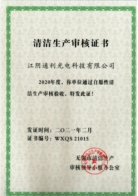 2021年2月通過無錫市清潔生產(chǎn)審核,并獲得審核證書。(上方右圖)