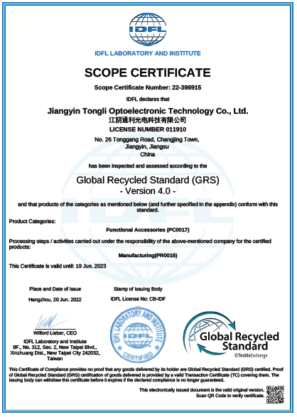 通利在大力推進(jìn)可降解產(chǎn)品,從根本上來降低對環(huán)境的傷害;同時(shí)加大對可回收產(chǎn)品工藝的 研發(fā)和制造,產(chǎn)品于2022年6月20日獲得GRS認(rèn)證。(上方左圖)
