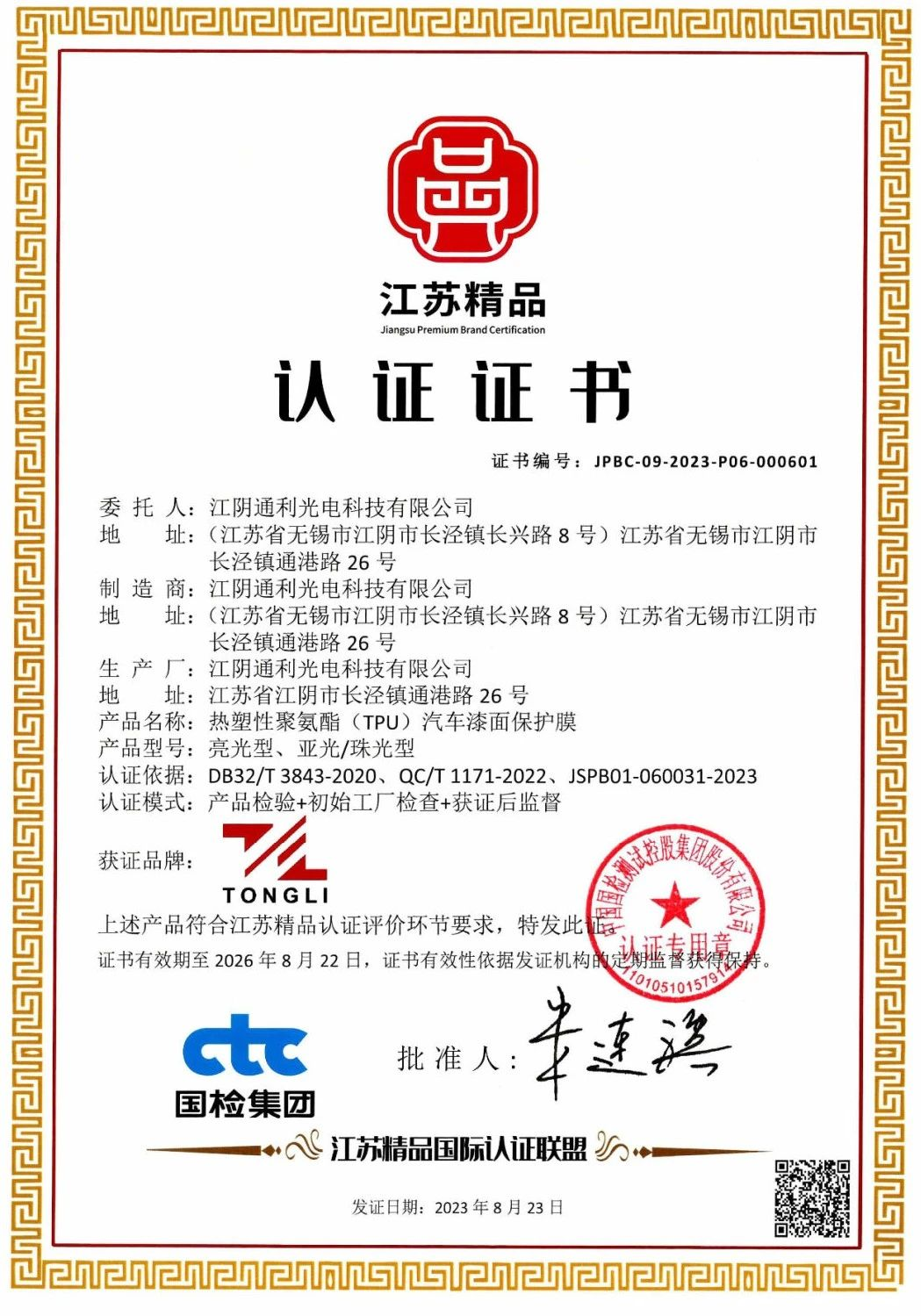 近期江陰通利光電科技有限公司的熱塑性聚氨酯(TPU)汽車漆面保護膜亮光型、亞光/珠光型通過了“江蘇精品”國際認證聯(lián)盟認證榮獲“江蘇精品”認證證書。