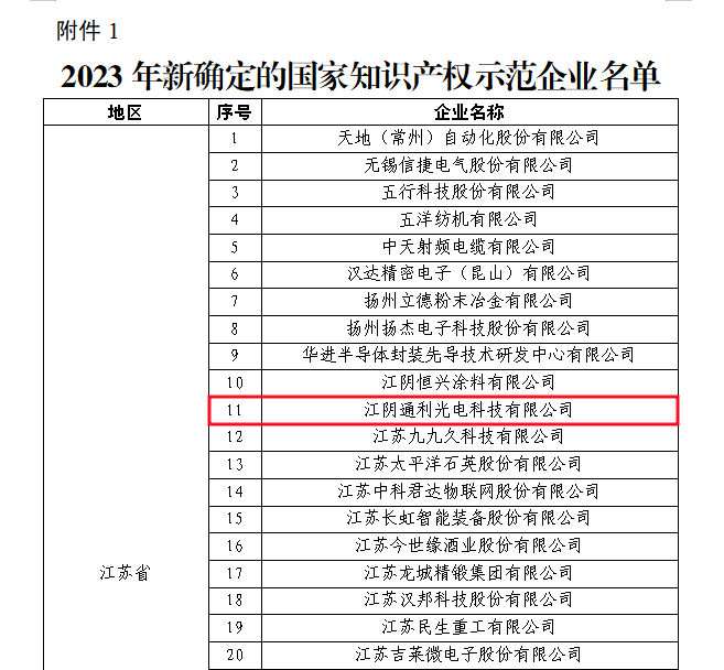 近日,國家知識產權局印發(fā)了《國家知識產權局關于確定2023年新一批及通過復核的國家知識產權示范企業(yè)和優(yōu)勢企業(yè)的通知》,江陰通利光電科技有限公司(以下簡稱”通利科技“)以優(yōu)異成績通過復審。據了解,2018年8月,通利科技被國家知識產權局認定為”國家知識產權示范企業(yè)“,時隔五年,國家知識產權局對已認定的知識產權示范企業(yè)進行復審考核,通利科技憑借行業(yè)內領先的研發(fā)創(chuàng)新實力、完備的知識產權管理體系,以及突出的知識產權管理水平,繼續(xù)保持該項榮譽。
